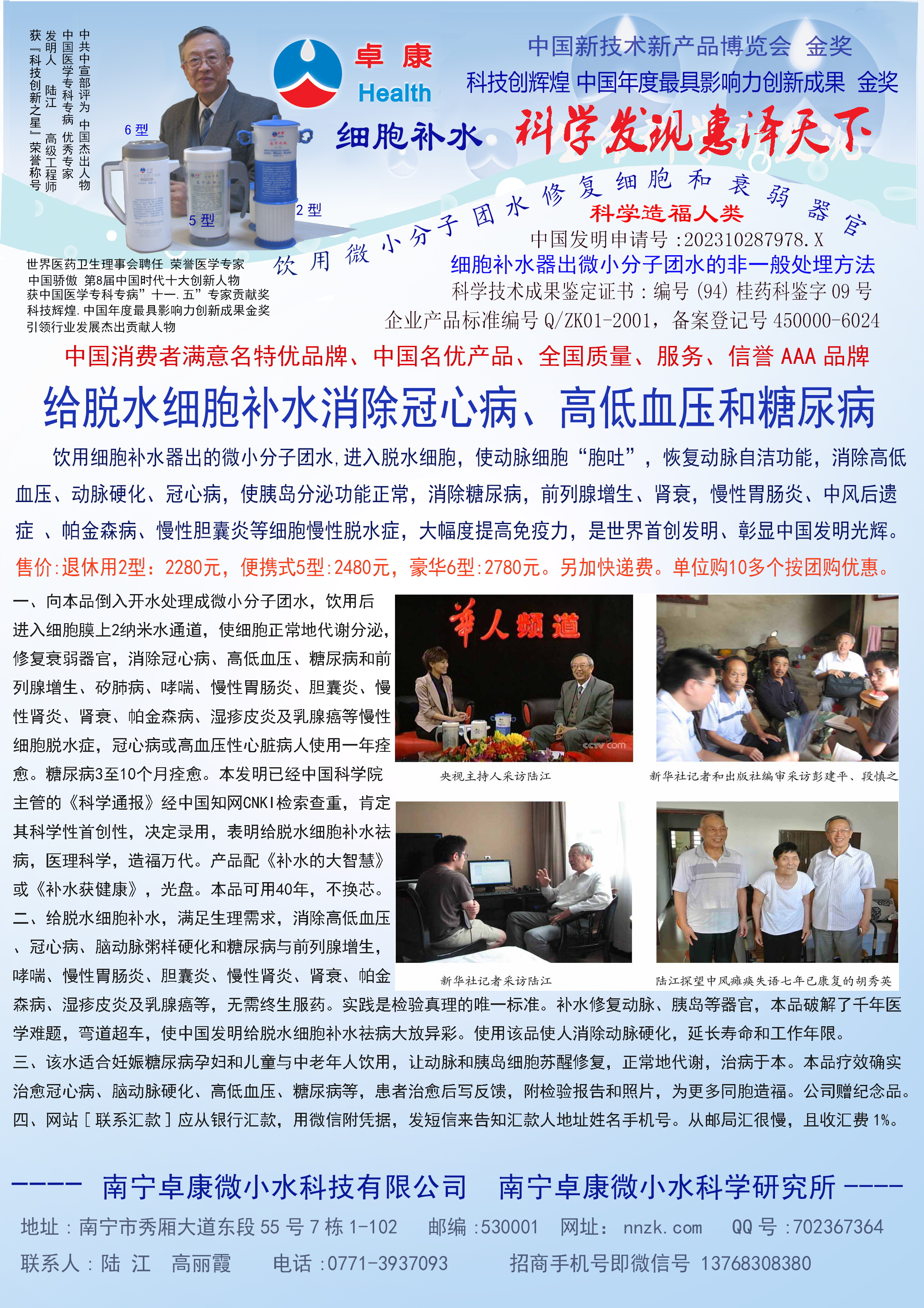 人類幾千年來患以上病癥需終生服藥,幾十年也不能治愈。可是我國南寧的高級(jí)工程師陸 江,于1990年想根治高血壓,研究發(fā)明了離子水瓶,處理出微小分子團(tuán)水供飲用,經(jīng)過醫(yī)院臨床試用和專家鑒定,1999年獲中國發(fā)明專利權(quán),產(chǎn)品于2000年投放市場(chǎng)后一直跟蹤調(diào)查,據(jù)全國各地用戶反饋:祛除了高低血壓、糖尿病和冠心病,并使前列腺增生、咽喉炎、鼻竇炎、慢性氣管炎、支氣管炎、矽肺病、哮喘、慢性胃炎、腸炎、慢性膽囊炎、慢性腎炎、腎衰、膀胱炎、便秘、痔瘡、風(fēng)濕性關(guān)節(jié)炎和濕疹皮炎及中風(fēng)后遺癥等病癥不藥而愈。為什么喝微小水能治20多種病?陸 江從1991年德國科學(xué)家發(fā)現(xiàn)細(xì)胞膜水通道僅為2納米獲得啟發(fā),認(rèn)為多種器官患病是因細(xì)胞脫水,不能正常代謝和分裂增殖,才使器官細(xì)胞減少致衰弱萎縮而形成細(xì)胞缺水性病癥。22年來的實(shí)踐有力地支持了“細(xì)胞脫水致病”這一重要論點(diǎn),表明喝微小水可滿足細(xì)胞的生理需求,補(bǔ)水就能祛病,是生命科學(xué)新亮點(diǎn)。