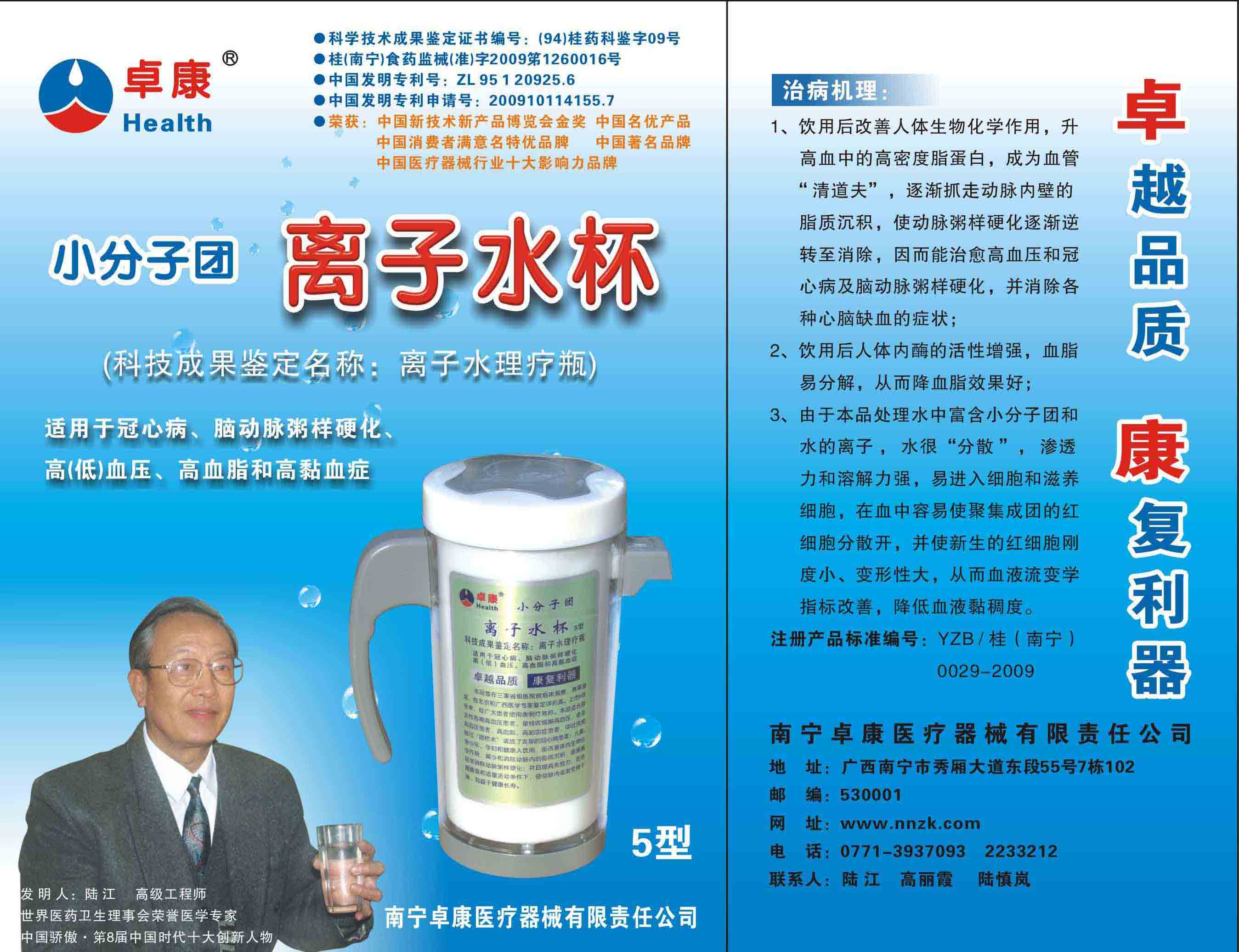 本品大量用戶的使用效果表明,能治愈冠心病、腦動(dòng)脈硬化、原發(fā)性高(低)血壓、高血脂、高粘血癥、高血尿酸癥(痛風(fēng))和2型糖尿病、衰弱器官并發(fā)癥(前列腺增生、腎衰與尿毒癥)及中風(fēng)后遺癥等療效好。產(chǎn)品配信譽(yù)卡。使用壽命30年,不換芯,易清洗。團(tuán)購優(yōu)惠。從郵局匯款,匯費(fèi)1%,地址按本頁下方地址、聯(lián)系人寫。從銀行匯款,請(qǐng)點(diǎn)擊[聯(lián)系匯款]欄,從工商銀行匯款,建設(shè)銀行、農(nóng)業(yè)銀行匯款,均免收匯費(fèi),匯款后20--30分鐘內(nèi)發(fā)短信,可用微信轉(zhuǎn)帳,均免匯費(fèi),微信號(hào)即手機(jī)號(hào)13768308380。匯款后,告知你的姓名和地址,我公司聯(lián)系人手機(jī)號(hào)是:13768308380。卓康牌離子水瓶為我公司獨(dú)家生產(chǎn),郵購產(chǎn)品配《補(bǔ)水的大智慧》彩印書一本,另配四季出版社出版的新書《補(bǔ)水的大智慧》一本,并配光盤一張(含央視主持人釆訪陸江的對(duì)話視頻)。目前市場(chǎng)和"淘寶網(wǎng)"上有人兜售假冒的偽品,望讀者審察辯別真?zhèn)危旒僬哓飧`假冒本公司的各種認(rèn)證、獲獎(jiǎng)獎(jiǎng)項(xiàng)、專利號(hào)和外包裝盒上的中英文字,包括科技成果的鑒定意見等,請(qǐng)讀者注意防偽。如何識(shí)別假貨?已經(jīng)買了假貨怎么辦?(請(qǐng)點(diǎn)擊[打假掠影][打假掠影])。